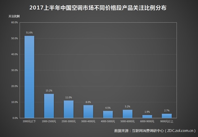 2017年上半年中國空調市場不同價格段產品關注比例分布