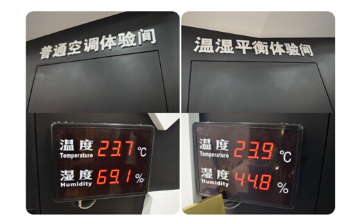 普通空調體驗間的溫度與大金溫濕平衡體驗間的溫度幾乎一致,但是濕度的差異卻相當大,在普通空調體驗間由于過高的濕度讓人感覺十分不適,有種悶熱的感覺;而在大金溫濕平衡體驗間,這樣的溫度和濕度下卻感覺很涼爽甚至有些冷。